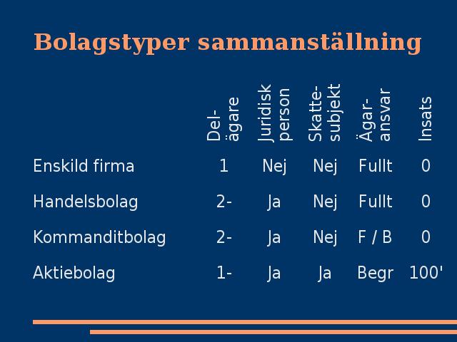 I ett kommanditbolag finns minst en komplementär som är fullt ansvarig och minst en kommanditdelägare som är begränsat ansvarig.