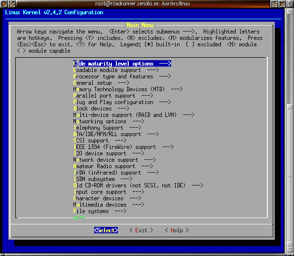 Det första som ska göras är att konfigurera kärnan och tala om vad som ska finnas med i kärnan. Om du kör i fönstermiljö (X-window System) och vill köra konfigurationen i ett separat fönster gör du: