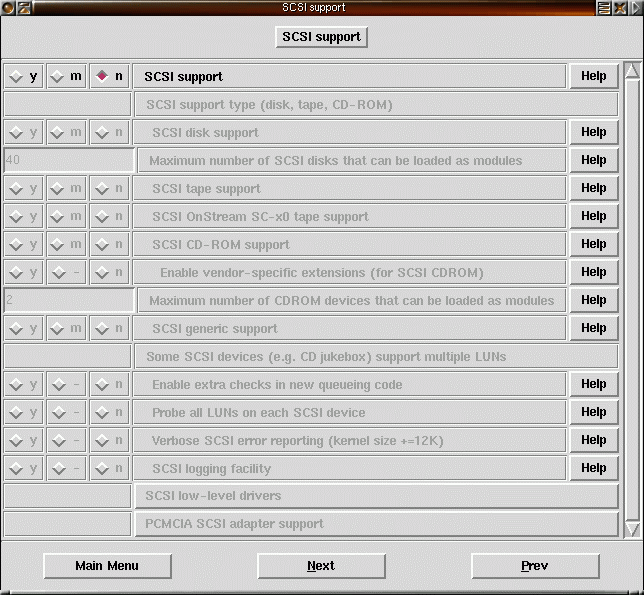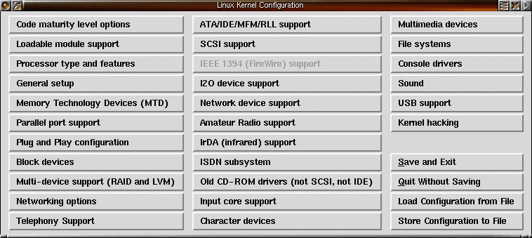 Huvudmenyn i xconfig ser ut på följande sätt: