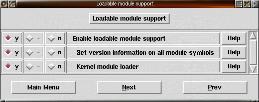 2) Slå på "Enable loadable module support" om du använder moduler. Slå på version information on all module symbols för att slippa kompilera om modulerna vid byte av kärna. Vill du att kärnan ska kunna ladda moduler automatisk när den behöver dem måste Kernel module loader aktiveras. Konfiguration av moduler görs i /etc/modules.conf (se nedan). |