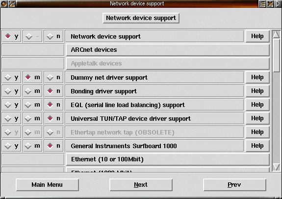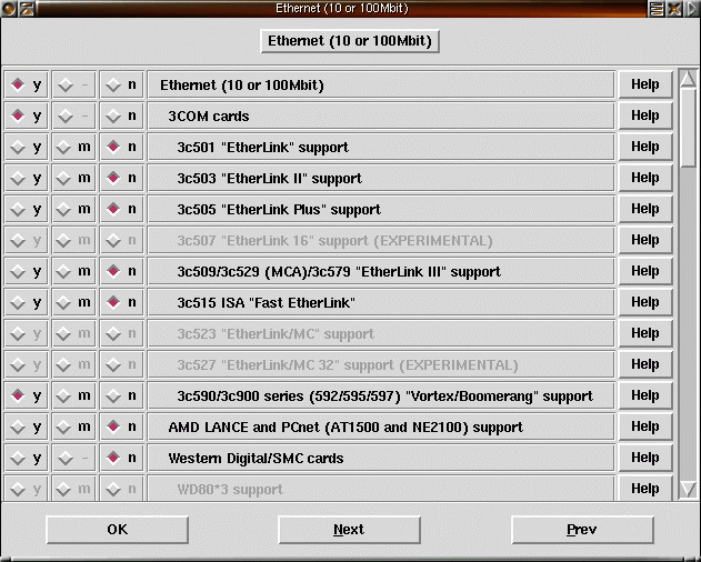 29) Välj det nätverkskort du har i din dator. Bland undermenyerna finns stöd för vanliga ISA/PCI 10/100Mbits-kort, 1000 Mbits-kort, trådlösa nät, token ring, WAN-kort och PCMCIA-kort. I nyare 2.4-kärnor har det tillkommit |