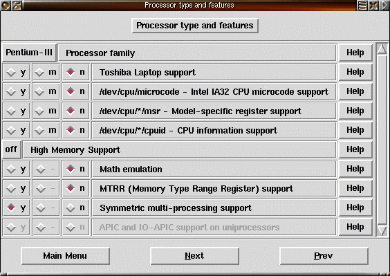 3) Välj att kompilera kärnan för 586 (Pentium) eller bättre beroende på vad du har för processor. Välj bort "Math emulation" såvida inte du har en gammal processor som saknar matteprocessor (vissa modeller av 386 och 486). Symetric multiprocessorstöd är till för de datorer som har fler än en processor. |