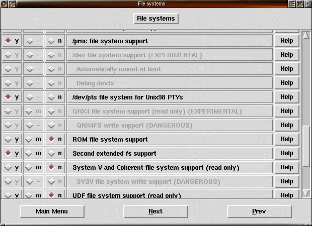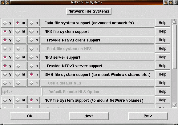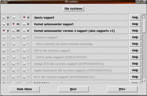 45) Fortsätt vidare till filsystem. Quota är ett system för att sätta upp gränser för hur mycket disk användare får göra av med. Kernel automounter är stöd i kärnan för att automatiskt montera NFS-filsystem (nätverksfilmonteringar). Reiserfs är ett journalfilsystem som kan användas istället för till exempel ext2 på en hårddiskpartition. Ett journalfilsystem för journal över ändringar i filsystemet. Vid krasch kan fortfarande de sista data som skrivs till fil försvinna men själva filsystemet förblir intakt tack vare journalfilen. Andra journalfilsystem som finns till Linux är IBM:s jfs och SGI:s xfs. |