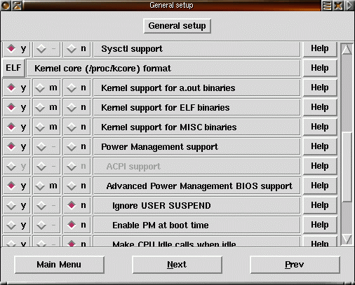 5) Stöd , support för olika typer av programformat (det gamla a.out och det nuvarande ELF). Se till att ELF är valt annars kommer inga Linuxprogram att fungera. Advanced Power Management BIOS support är stöd för att spara ström i till exempel bärbara datorer. |