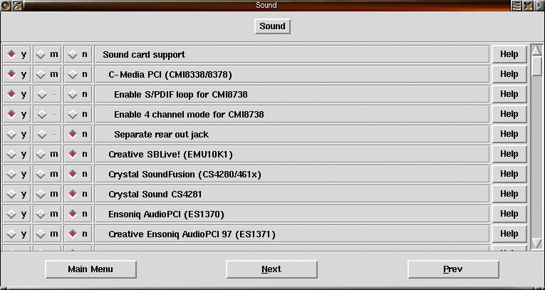 53) Om du har ett ljudkort i datorn slå på ljudstöd och välj rätt ljudkort. Lämpligtär att lägga stödet som modul till kärnan. |