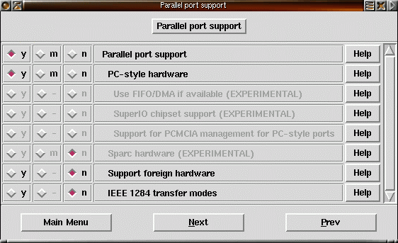 8) Slå på parallportsupport och PC-style för att få stöd för den vanliga parallellporten. I nyare 2.4-kärnor finns stöd för multi io-kort med både serieportar och parallellportar. Har du ett sådant kort bör du välja stöd för den. |